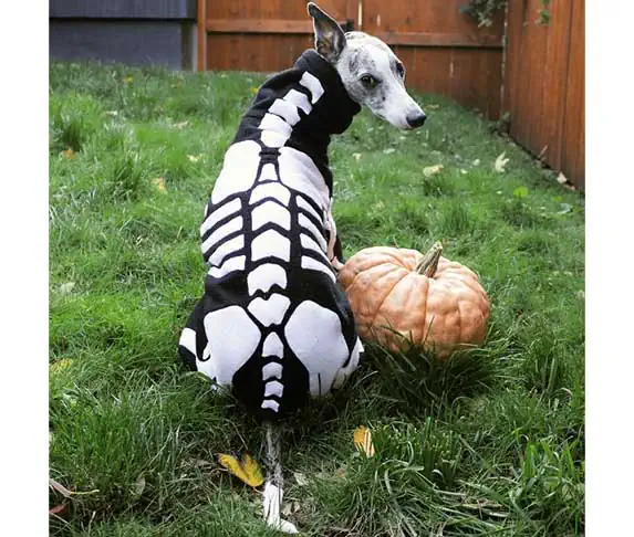 For a ready-made option, check out the ‘Pet Halloween Skeleton Outfit’ on Amazon.