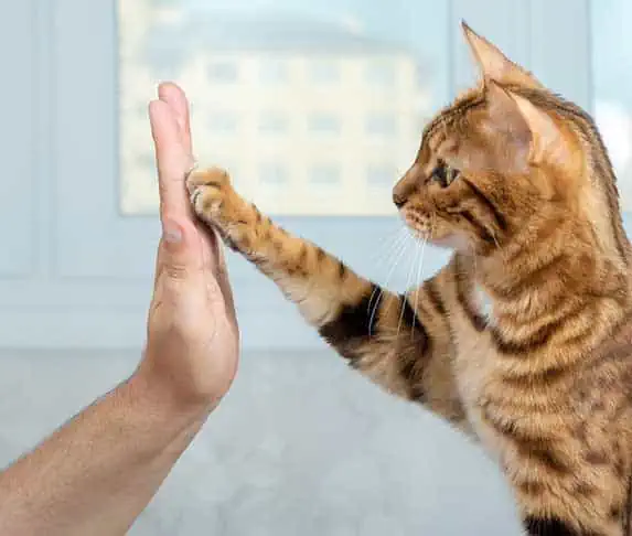 - Say “High five!” right as you offer flat palm until kitty independently lifts paw